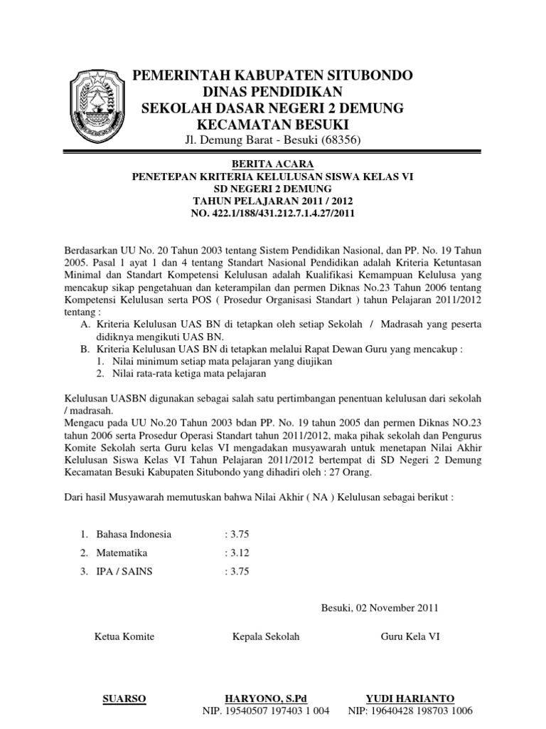 Berita acara rapat penentuan kelulusan siswa kelas ix sekolah indonesia cairo tahun pelajaran 2019/2020 no. Contoh surat kelulusan dan berita acara kelulusan untuk sd/mi, smp/mts dan sma/ma, selamat pagi semuanya, semoga sehat selalu dan mendapatkan magfirrah dari tuhan yang maha kuasa. Dimana sekolah dapat menentukan kriteria kelulusan sendiri. Satu tahun pelajaran tidak terasa akan berakhir, maka seperti pada tahun sebelumnya sekolah segera membuat surat keterangan kelulusan peserta didik tingkat akhir pada jenjang satuan pendidikan sd, smp, sma, dan smk. Bahwa siswa yang dinyatakan lulus 98 orang, dan yang tidak lulus 1 orang.